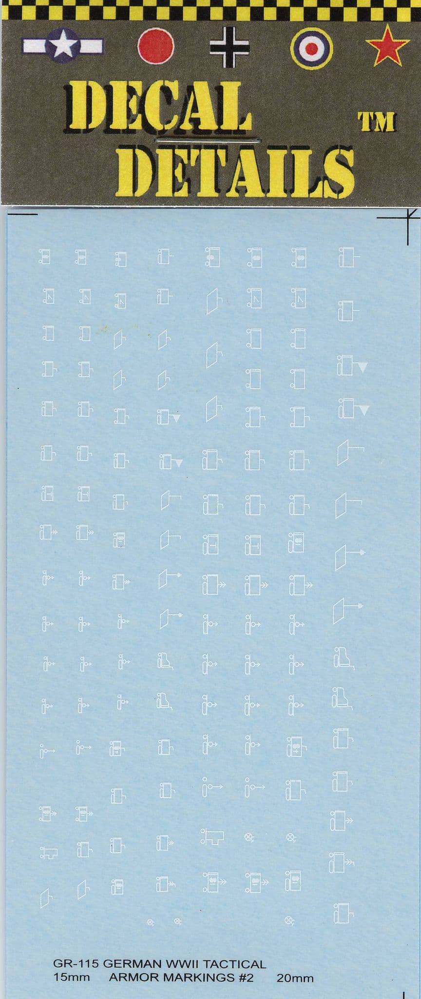 GR-115 WW2 German Army Tactical Symbols, Pz Gren, Recon, etc, for 15 / 20mm armor. 2 sheets per pack, waterslide decals
