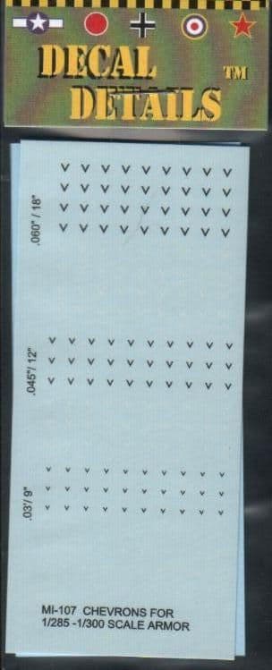 MI-107 white and black Chevrons in .03"/.045'/.06" (.075, 1.1 and 1.5mm). 60 each black, white in .03", .045" and 72 each white and black per pack at .06". 2 sheets per pack.